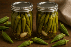 Sterilize jars, pack with okra + spices, pour boiling brine, cool, refrigerate, wait a week.